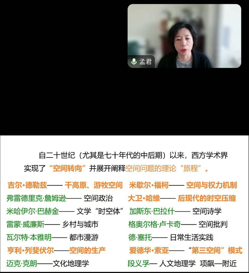 讲座中,孟君教授分别从空间理论的"空间转向" 、电影的"空间转向"和电影的三种空间叙事方式三个方面,系统而详尽地阐释了电影空间既生产“意义”,也通过“意义”解读进行再生产。孟君教授深入剖析了三种电影空间叙事包括社会容器、乌托邦、故事宇宙等内容,展现出对于电影而言,空间是“根本”要素,而不是“附带”要素。她认为,电影空间强大的叙事建构功能证明,空间是电影叙事的“根本范畴”,而非次要的叙事元素。在电影的各种叙事元素里,电影空间是用于理解电影艺术和社会实践之间关系最好的中介之一。从电影文本的生产到电影的整个传播系统,电影无疑具有强烈的社会性,电影不仅是社会的“反射镜”,还是社会的“驱动器”。消隐的电影空间应当逐步“浮现”出来,从“后台”到前景中。同时,孟君教授还对国内外电影作品空间美学特征进行了探讨。