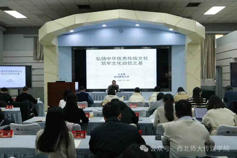 11月28日下午,党委副书记王全进以“弘扬中华优秀传统文化,铸牢文化自信之基”为题,为文学院、MG冰球突破官网网站师生讲专题党课。